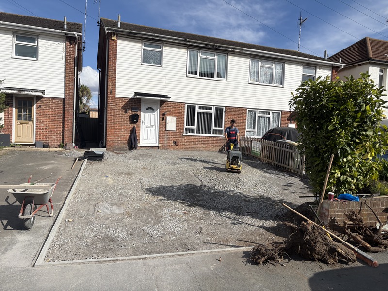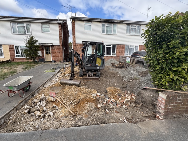 1. Site Clearance & Excavation: The first was to clear the entire area. We removed the old concrete path, dug up the lawn, and excavated any shrubs and roots. The site was dug down to the correct depth to ensure a solid foundation for the new driveway.