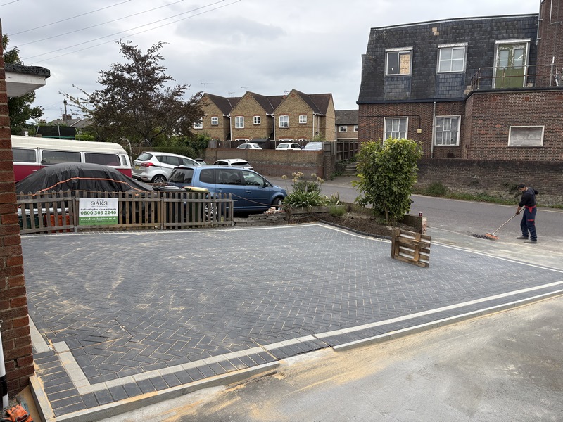 3. Laying the Block Paving: With the foundations in place, we began laying the pavers. The main body of the driveway was laid using high-quality charcoal block paving in a classic herringbone pattern. The standout feature is the border, which consists of a charcoal header, a crisp white pinstripe, and a final charcoal edge, creating a sharp and defined look.