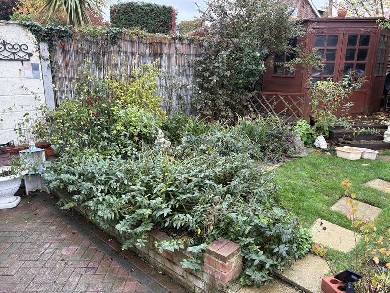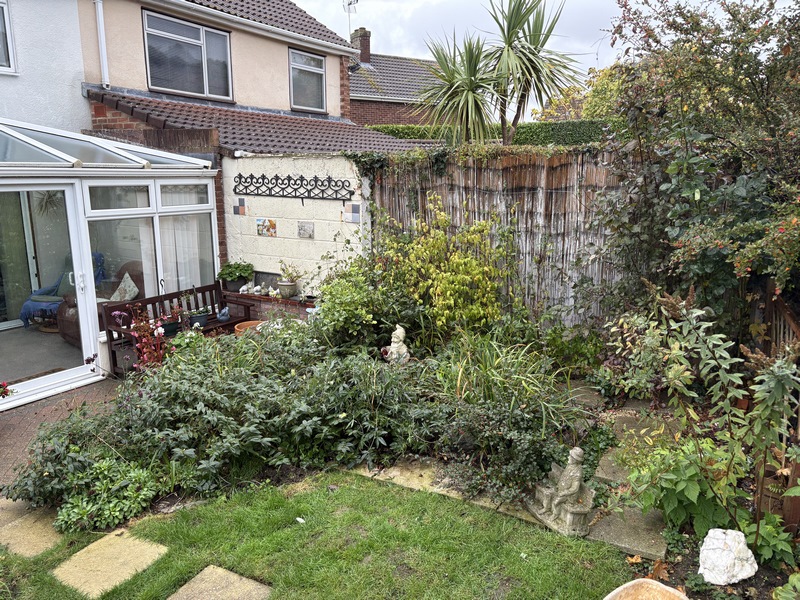 Before: The garden was overgrown and cluttered, with an unused raised bed taking up valuable space and making the area difficult to maintain.