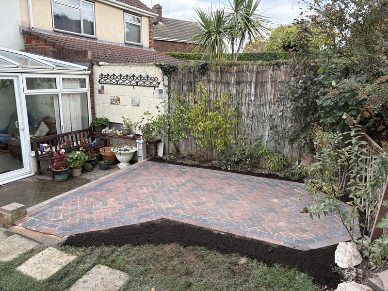 4. Block Paving Installation: The patio surface was laid using red and charcoal block paving in a herringbone pattern, chosen for its classic, timeless appearance and durability.