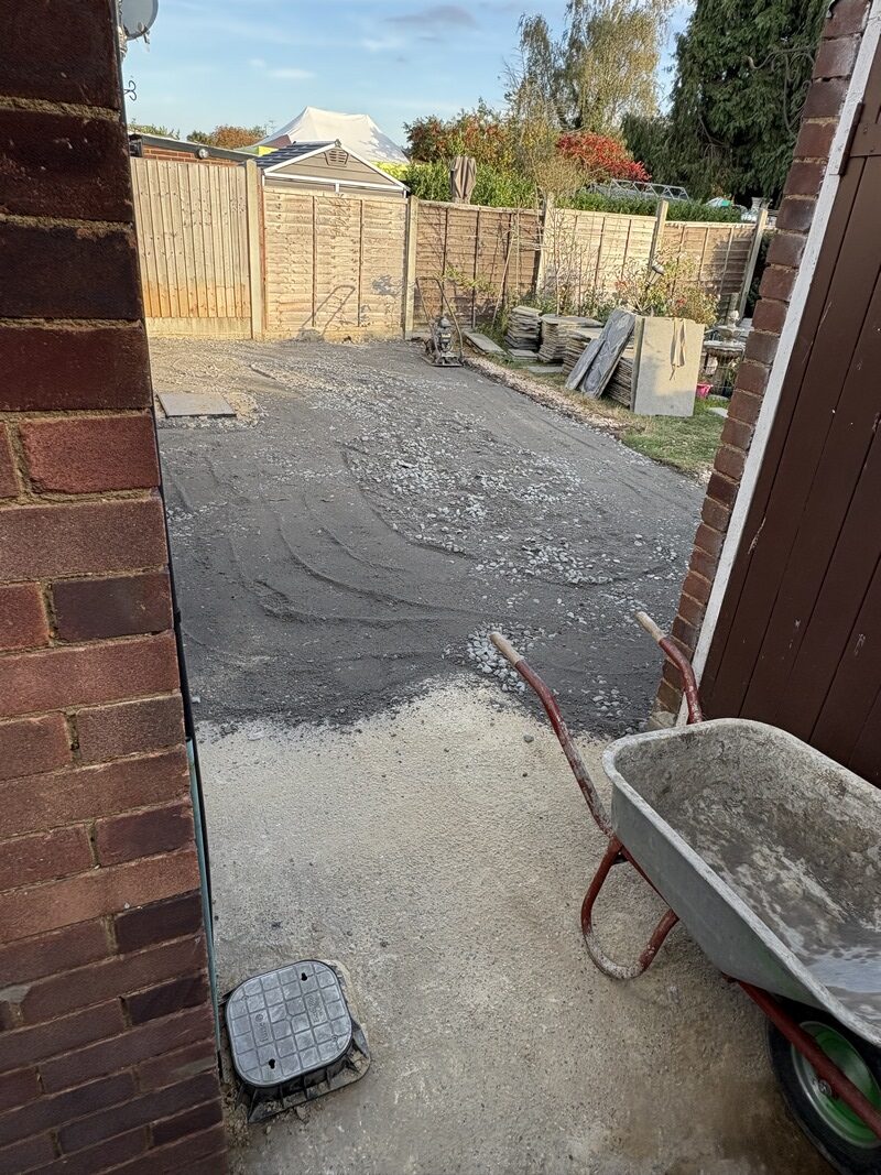 2. Groundwork & Base Layers: A new MOT type 1 hardcore base was installed and compacted, ensuring a strong and stable foundation for both the patio and driveway extension.