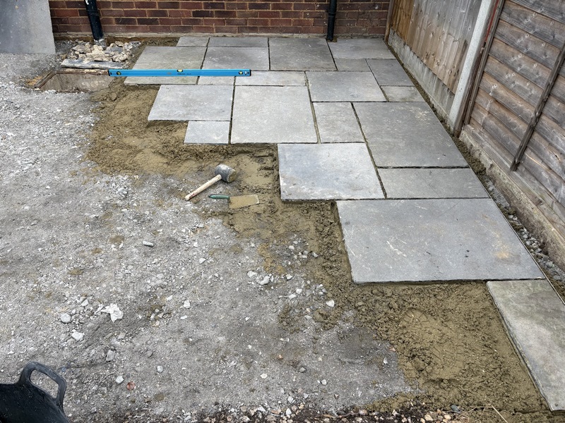 3. Sandstone Patio Installation: High-quality natural sandstone slabs in mixed sizes were laid on a full mortar bed. Each slab was levelled carefully to achieve a flawless finish and subtle falls for water damage.